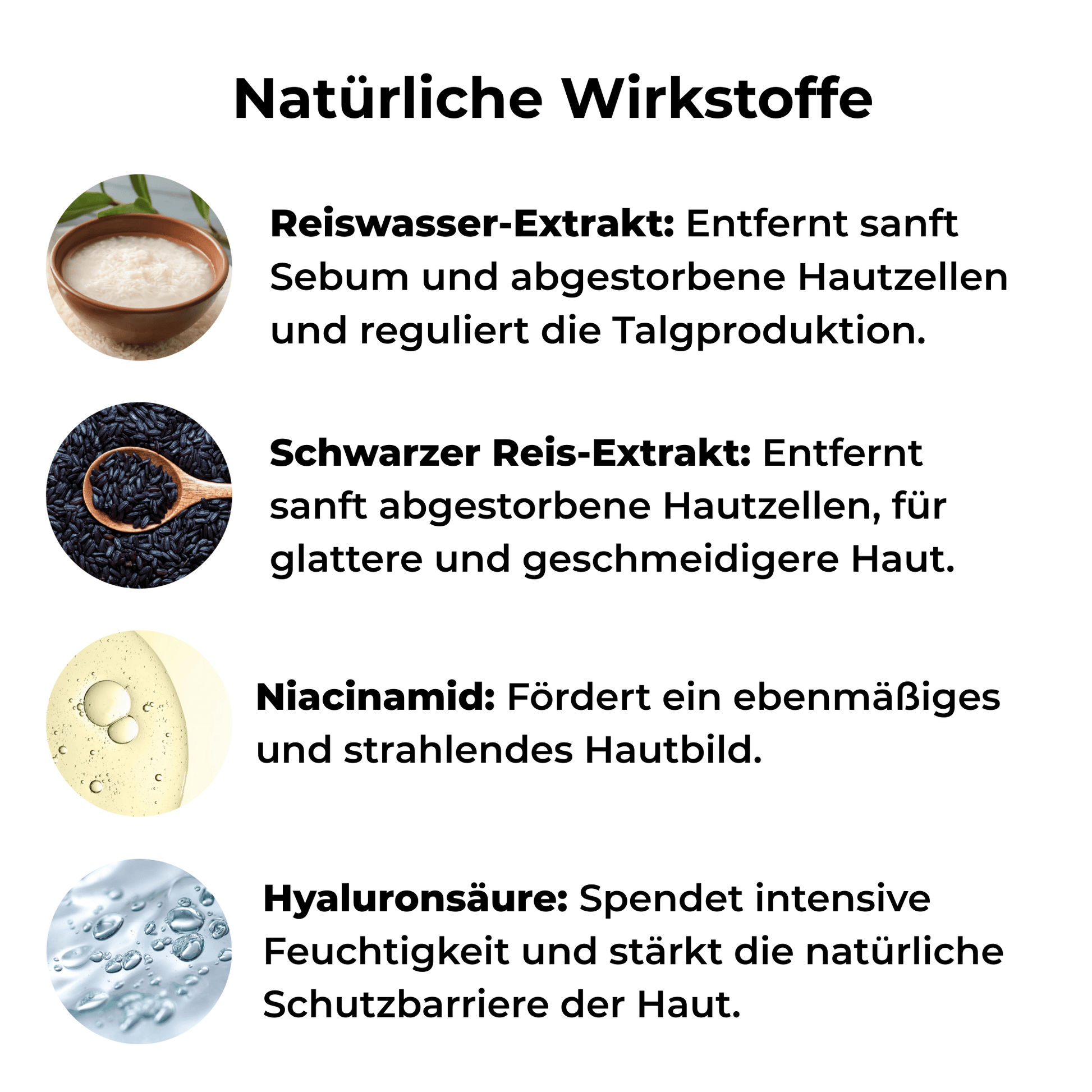 Schwarzer Reis-Extrakt: Entfernt sanft abgestorbene Hautzellen, für glattere und geschmeidigere Haut.